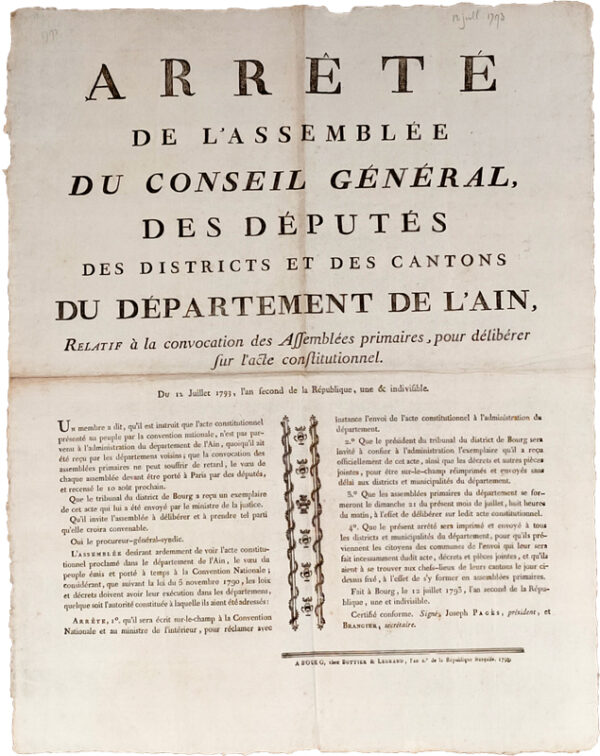 Affiche. Arrêté de l’Assemblée du Conseil Général, des Députés des Districts et des Cantons du Département de l’Ain, Relatif à la convocation des Assemblées primaires, pour délibérer sur l’acte constitutionnel ; du 12 juillet 1793.