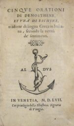 Cinque orationi di Demosthene, et una di Eschine, traddotte di lingua Greca in Italiana, secondo la verita de sentimenti.