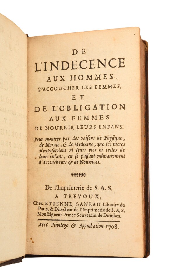 Edition originale de cet ouvrage curieux, qui est le premier ouvrage de Hecquet dont la thèse n’a pas été suivie d’effet car les femmes elles-même préfèrent avoir la présence d’un médecin ou d’un chirurgien au cas où une complication viendrait à survenir ; sa deuxième thèse, bien que médicalement fondée, n’a pas très bien réussi non plus car le débat, trois siècles après, est toujours ouvert ! Notons que les organisations féministes ont réédité cet ouvrage, surtout pour la première partie. Malgré le Privilège qui est en fin de volume, qui attribuait l’exclusivité de l’imprimerie de Trévoux à Etienne Ganeau, la plupart des exemplaires portent le nom de Jacques Etienne. Minime restauration à la coiffe inférieure et à un coin. Minuscule usure aux coins et toute petite auréole à quelques coins (Sirand-366, avec une erreur de date, corrigée par le comte Douglas).